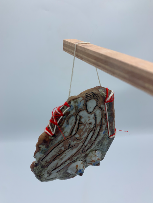 sister became my first exploration of gender complexity within my ceramic art practice. I engraved myself as a faceless, (perhaps) uncomfortable, and vulnerable figure. I was able to create a version of myself with no breasts, embodying a post-operative image through the temporality of clay. This allowed me to imagine a permutation of my body as malleable (note: the breasts “set” off to the side). Gender affirming surgery is a regular curiosity of mine as a gender fluid individual - although I remain unsure in my intention to receive this form of gender affirming medical care.